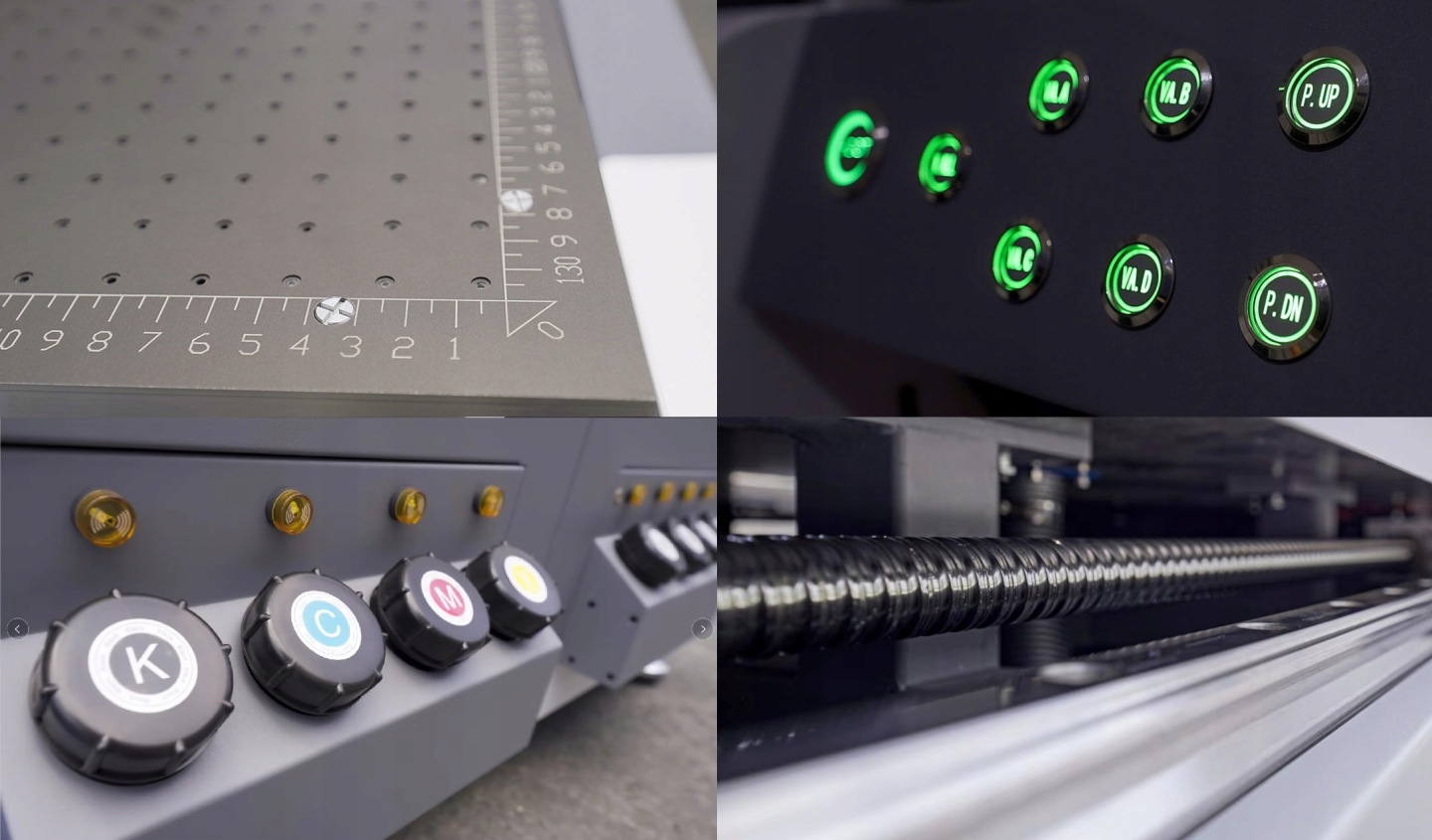 Drukarka wyposażona jest w 3 (opcjonalnie 4) głowice drukujące Ricoh gen. 5. Wykonane ze stali nierdzewnej zapewniają dużą żywotność z częstotliwością natryskiwania 30kHz.